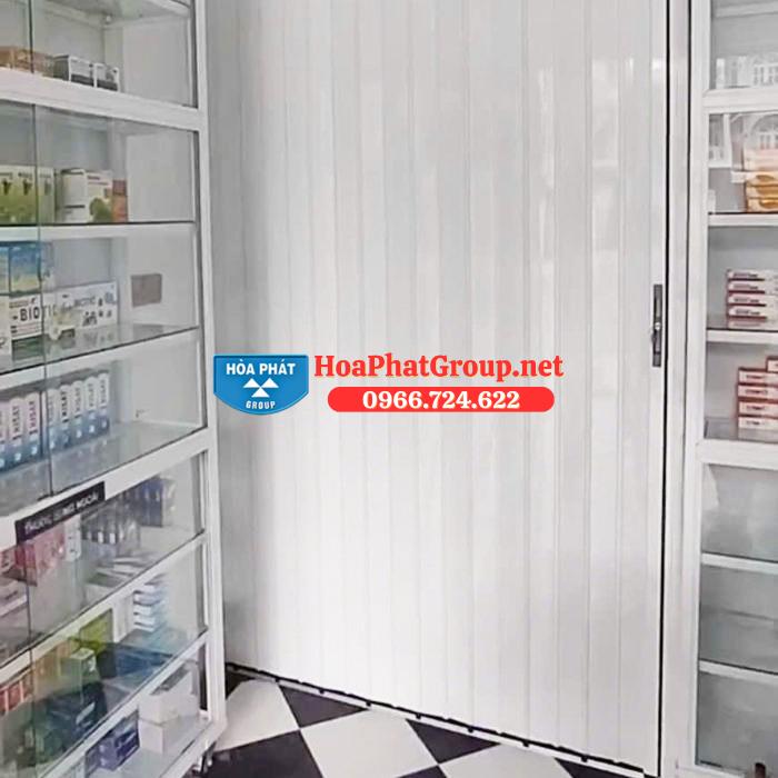Lắp đặt cửa xếp nhôm trắng cho cửa đi nhà thuốc, cửa hàng