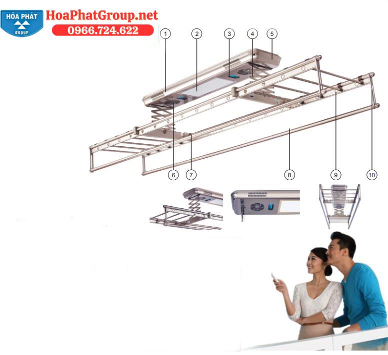Sản phẩm bao gồm 1 thân máy được gắn lên trần, tay đỡ, dây cáp và 4 thanh phơi. ( 2 thanh phơi quần áo + 2 thanh phơi chăn màn +8 thanh ngang kết hợp treo đồ)